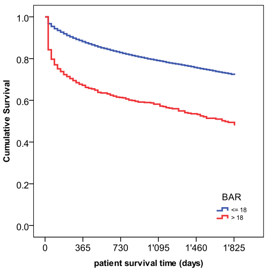 With increasing BAR points, patient survival is decreasing. However, while mortality is linearly increasing with increasing MELD or SOFT score, mortality is stable in the BAR up to 16, and then exponentially increasing at BAR 18.